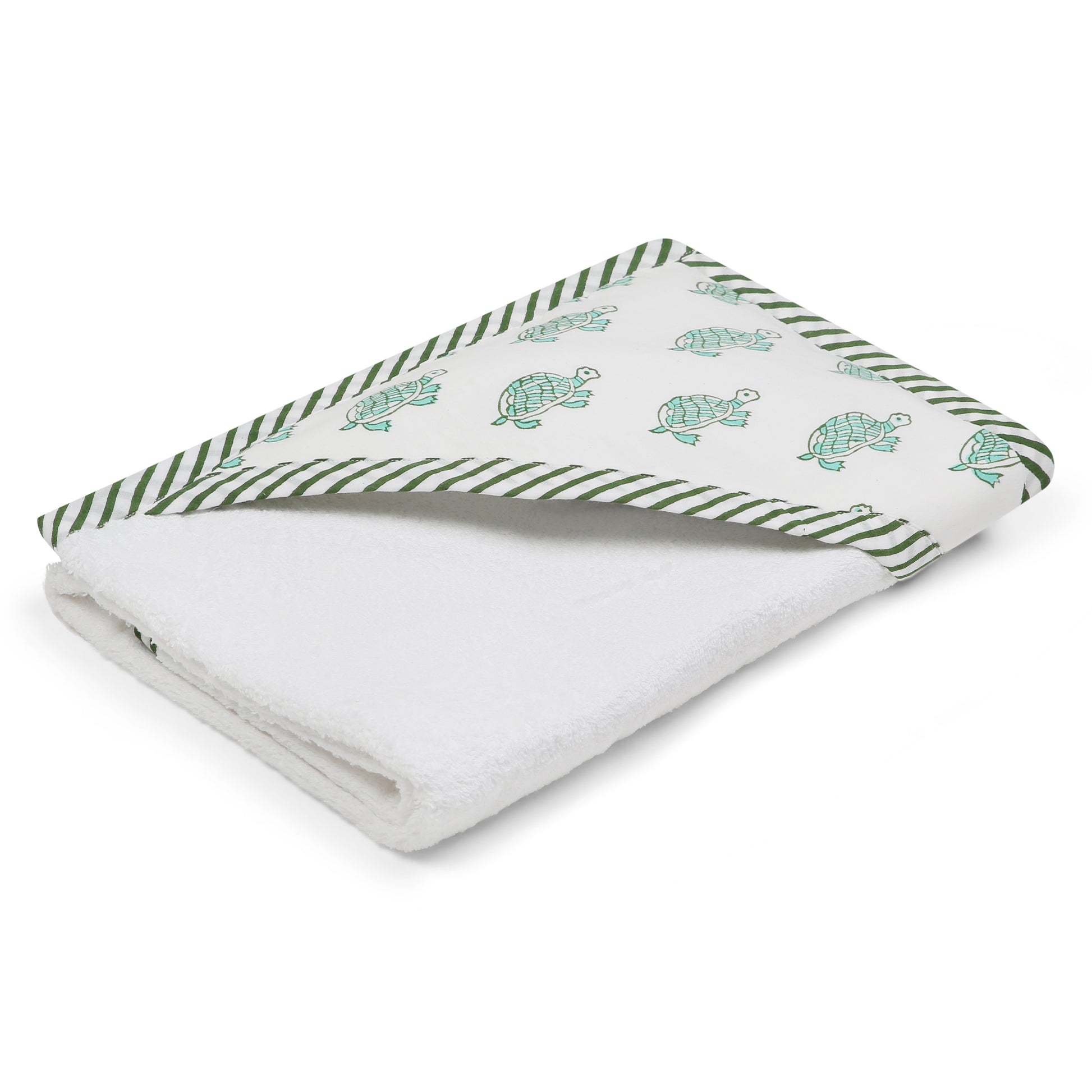 A beautiful soft hooded baby towel with a unique turtle hand block printed design on the hood.