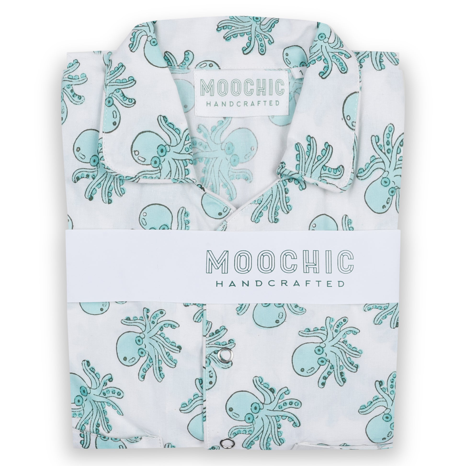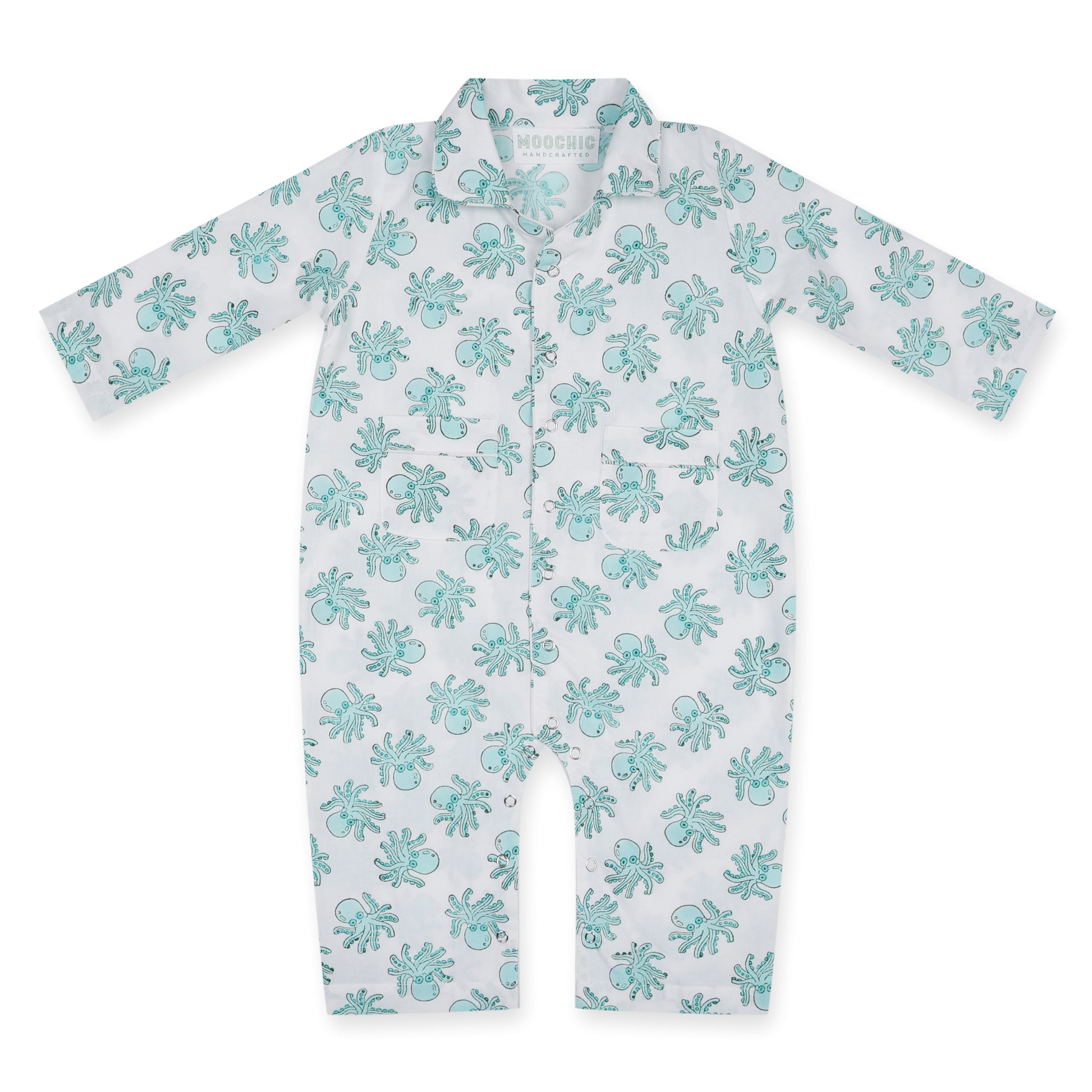 Gorgeous onesie hand printed with a turquoise blue octopus block design. Popper fastening for easy changing.