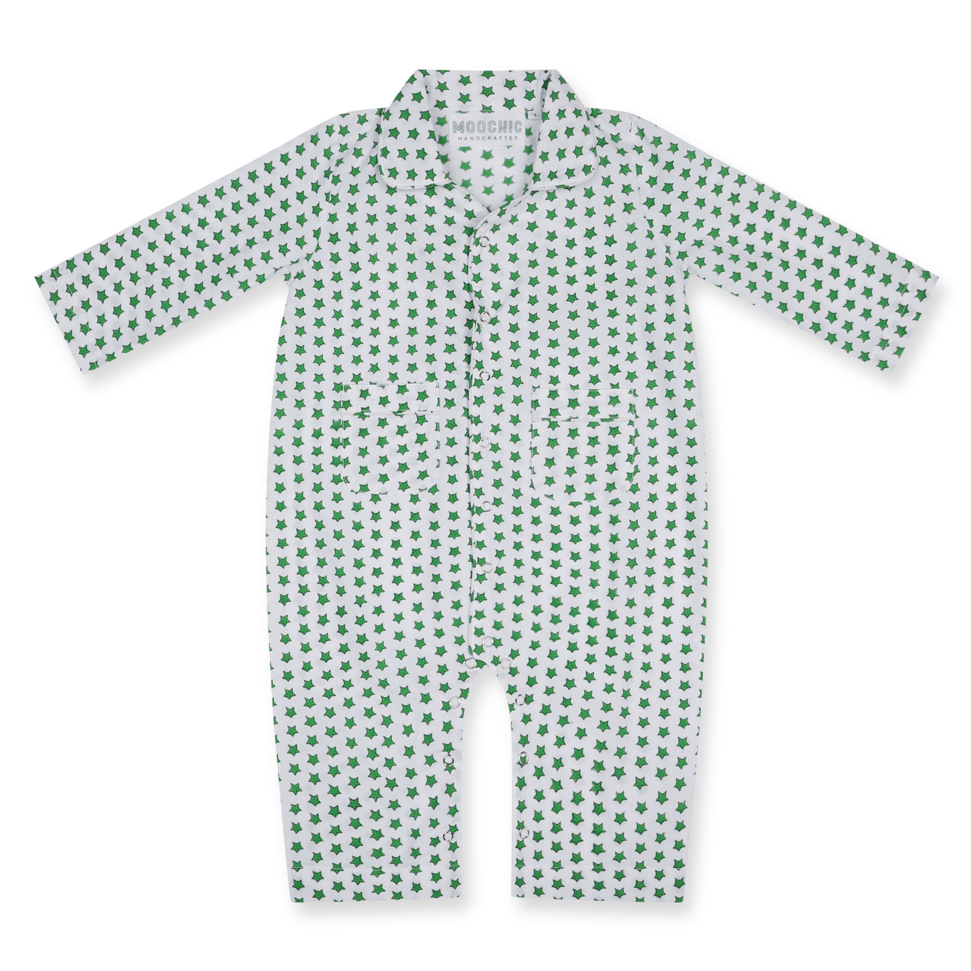 Gorgeous onesie hand printed with a bright green star block design. Popper fastening for easy changing.