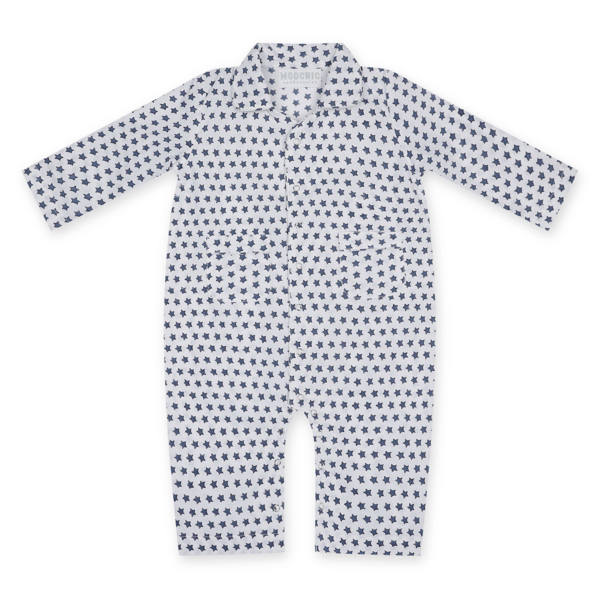 Gorgeous onesie hand printed with a navy blue star block design. Popper fastening for easy changing.