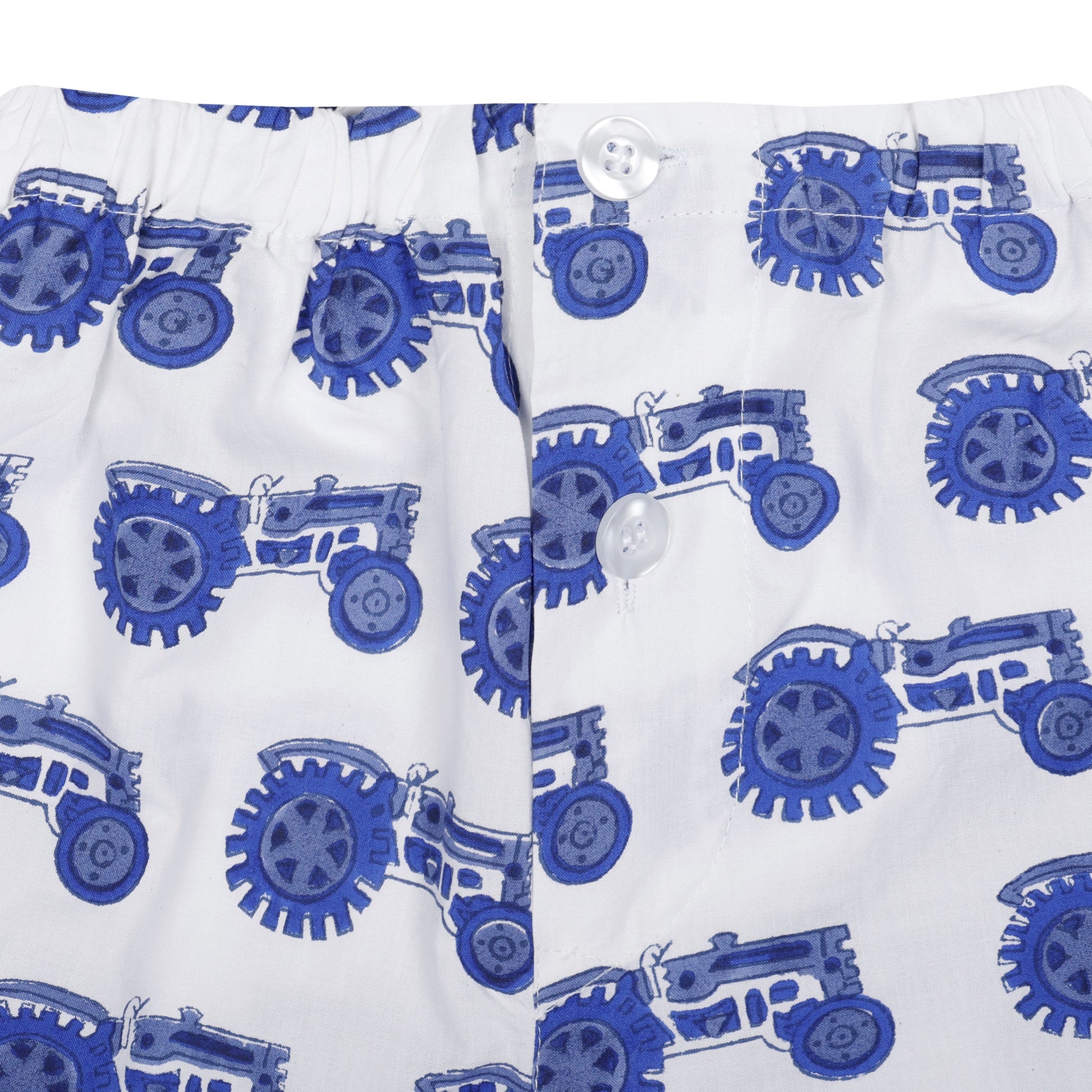 Gorgeous pyjamas hand printed with a blue tractor block design.