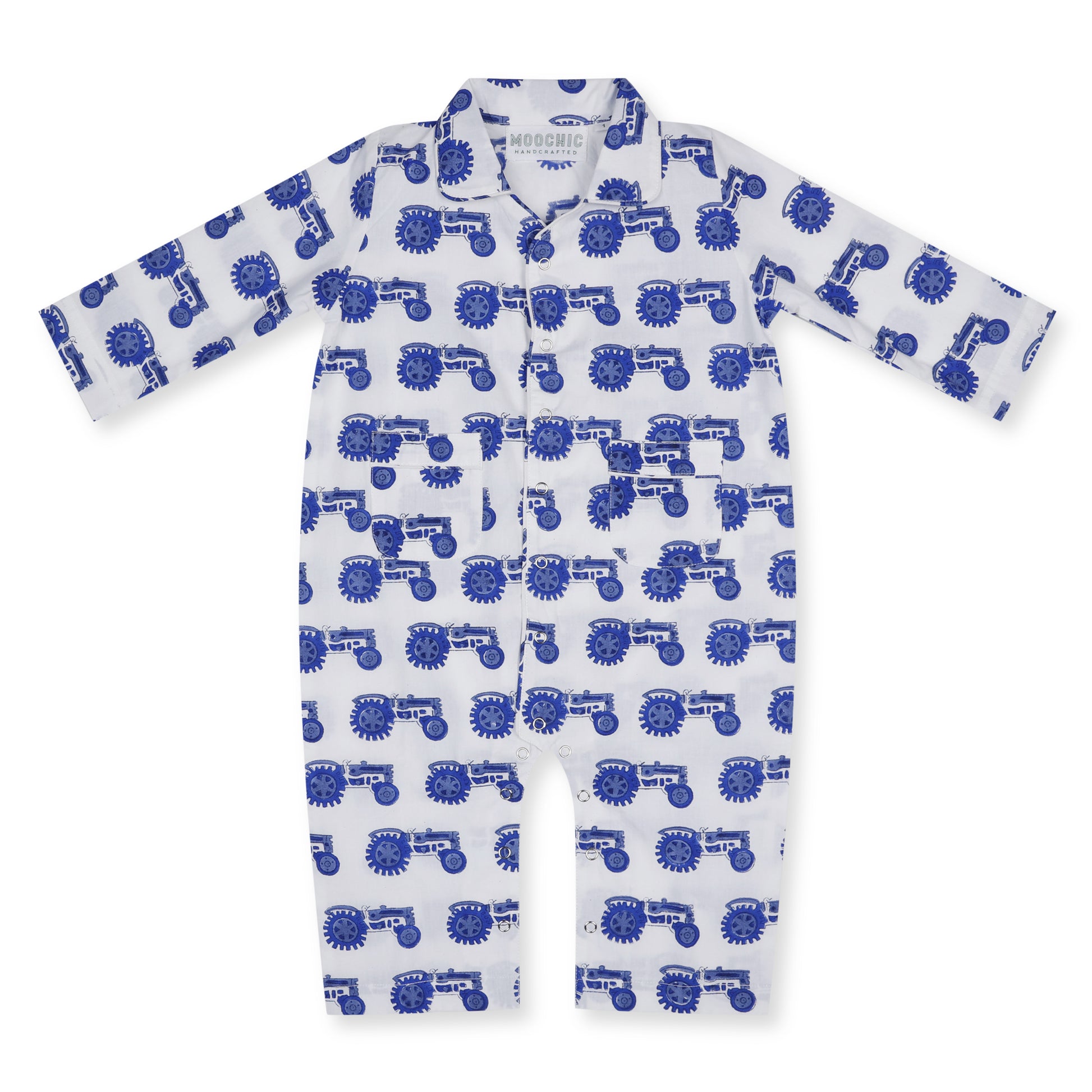Gorgeous onesie hand printed with a bright blue tractor block design. Popper fastening for easy changing.