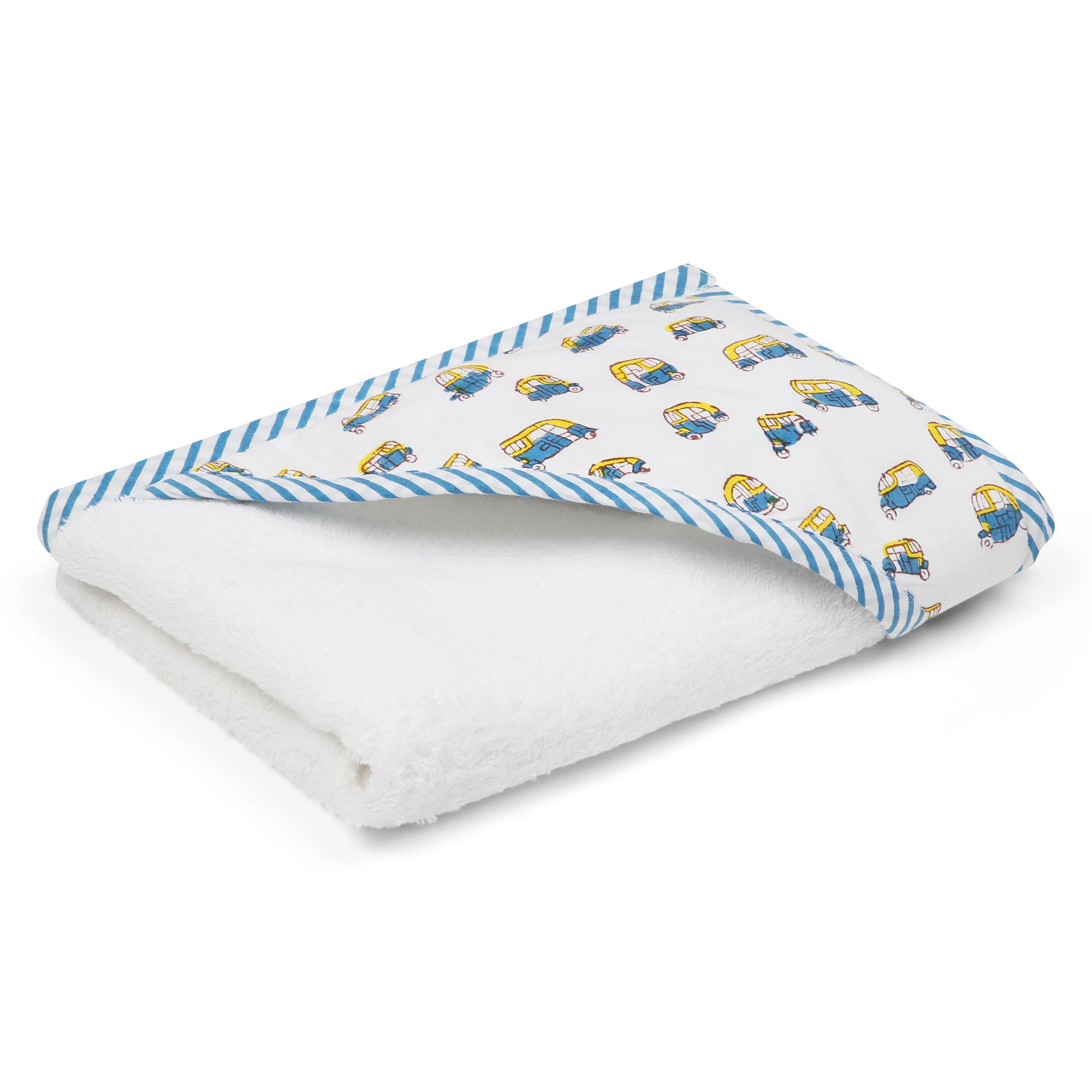 A beautiful soft hooded baby towel with a unique tuk tuk hand block printed design on the hood.