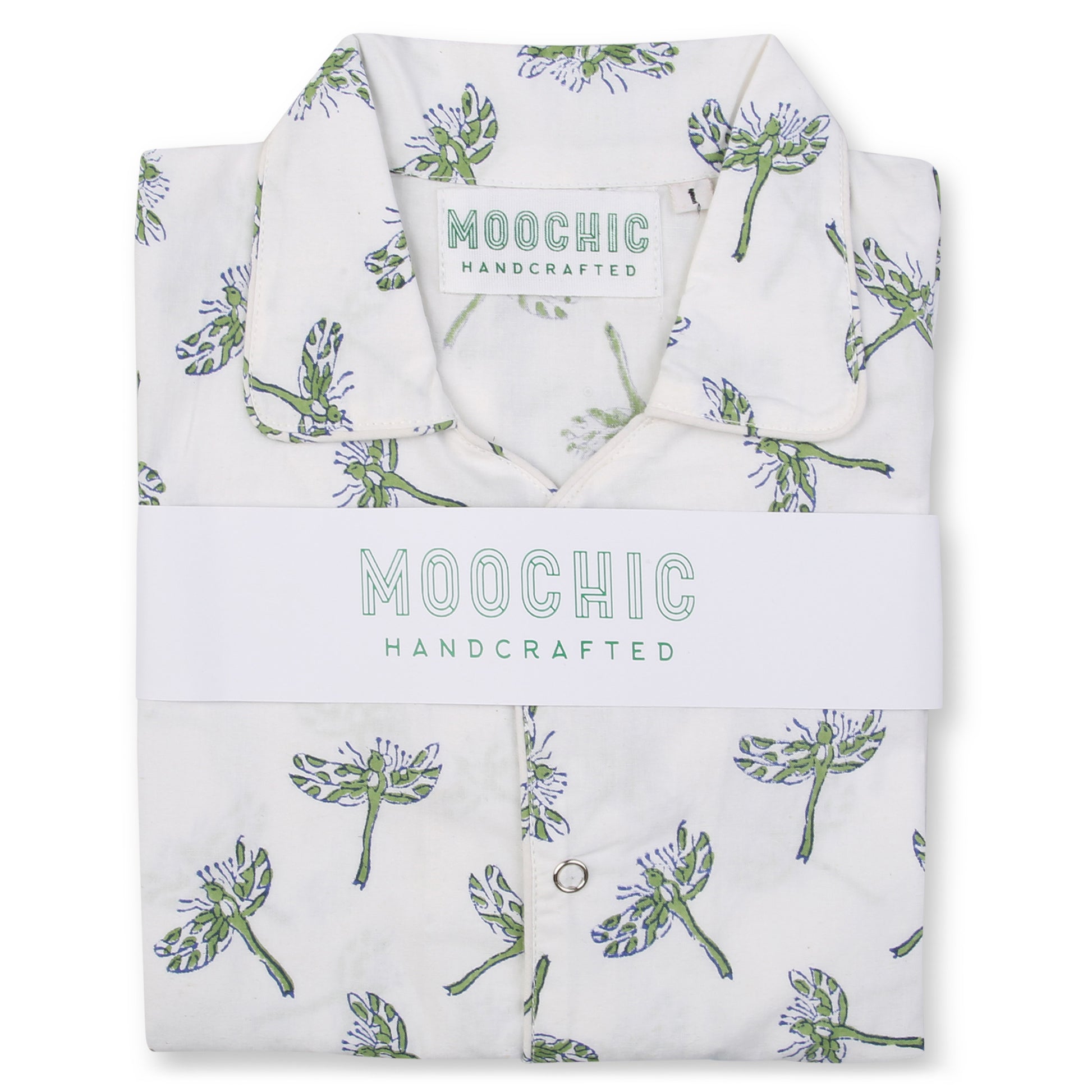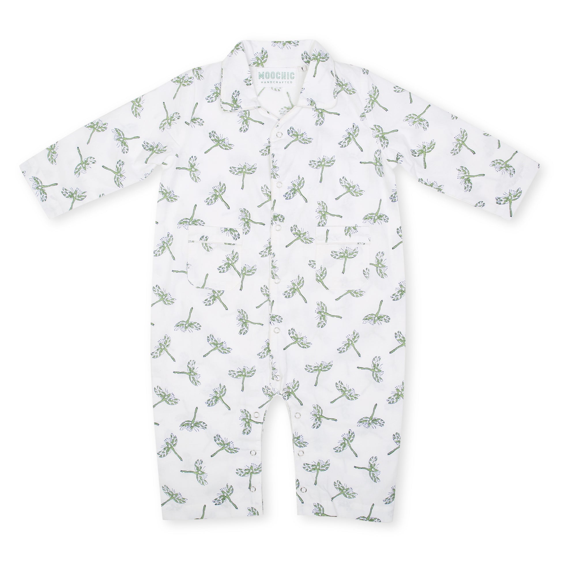 Gorgeous onesie hand printed with a soft green and blue dragonfly block design. Popper fastening for easy changing.