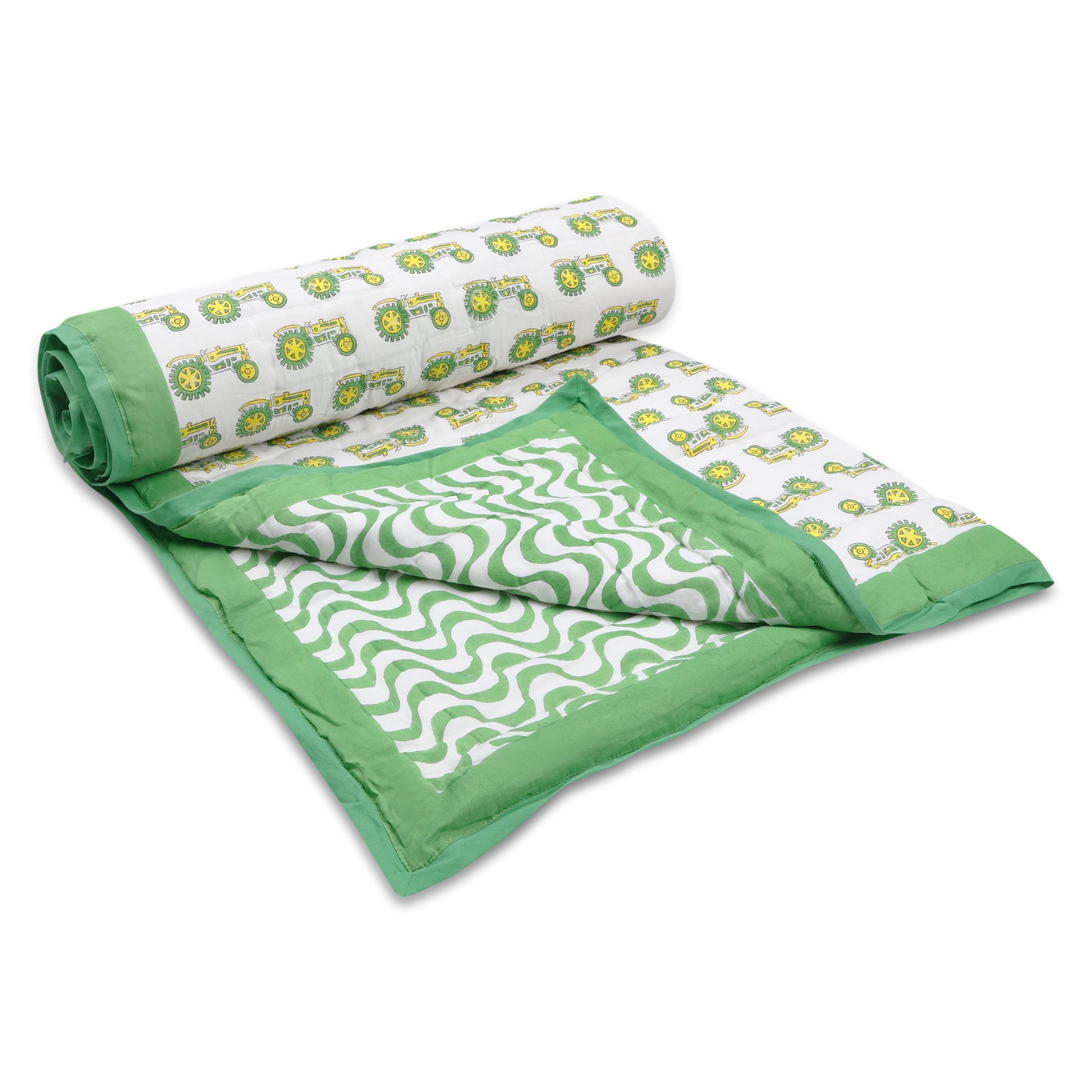Hand block printed on 100% pure cotton and stuffed with cotton too, this quilt is breathable, soft and snuggly. Each quilt has a coordinated print on the reverse and fits a standard size UK cot bed. They make ideal bedding for up to age five but are popularly used as TV blankets for older children (and adults!) and as play mats and picnic mats for tiny tots.