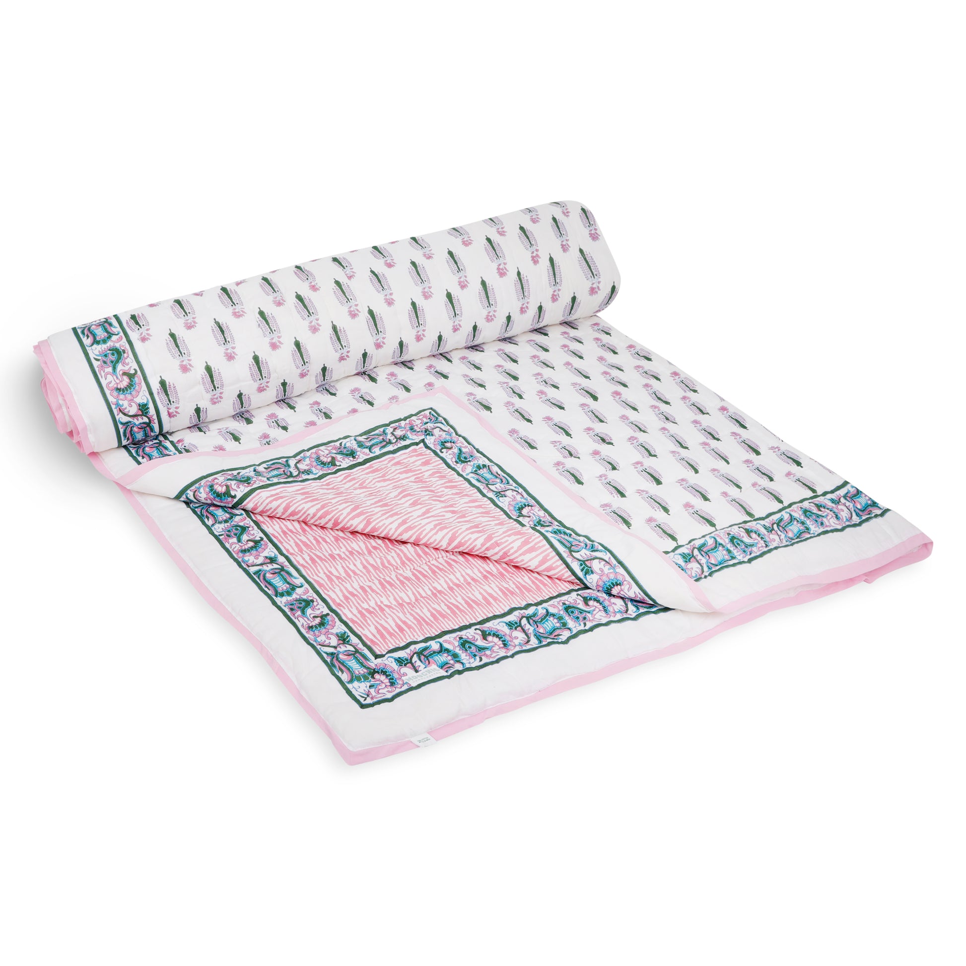 A stunning king sized cotton hand quilted quilted blanket, block printed in our Pink and Green Wisteria with a complimentary geometric block on the reverse. These quilts are filled with cotton and hand quilted making the most exquisite bedding.