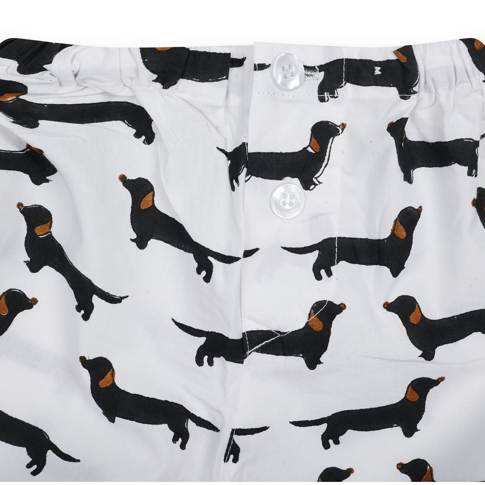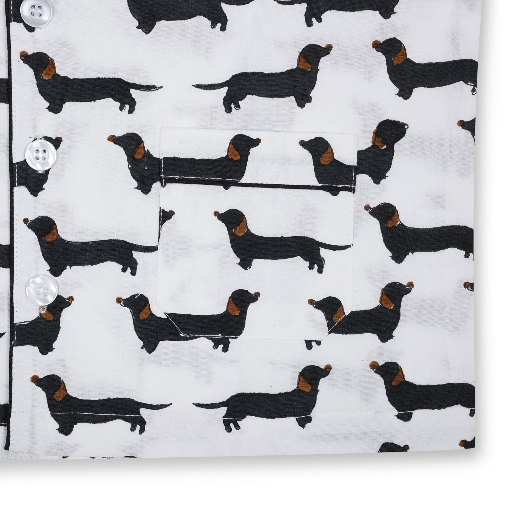 Gorgeous pyjamas hand printed with a brown and black sausage dog block design.