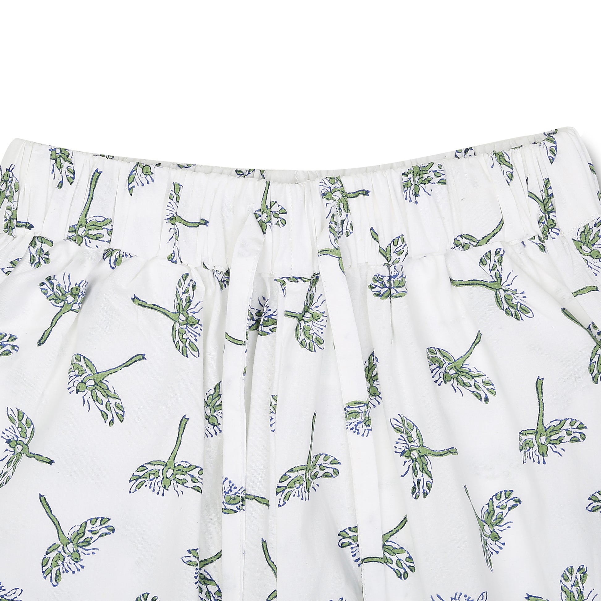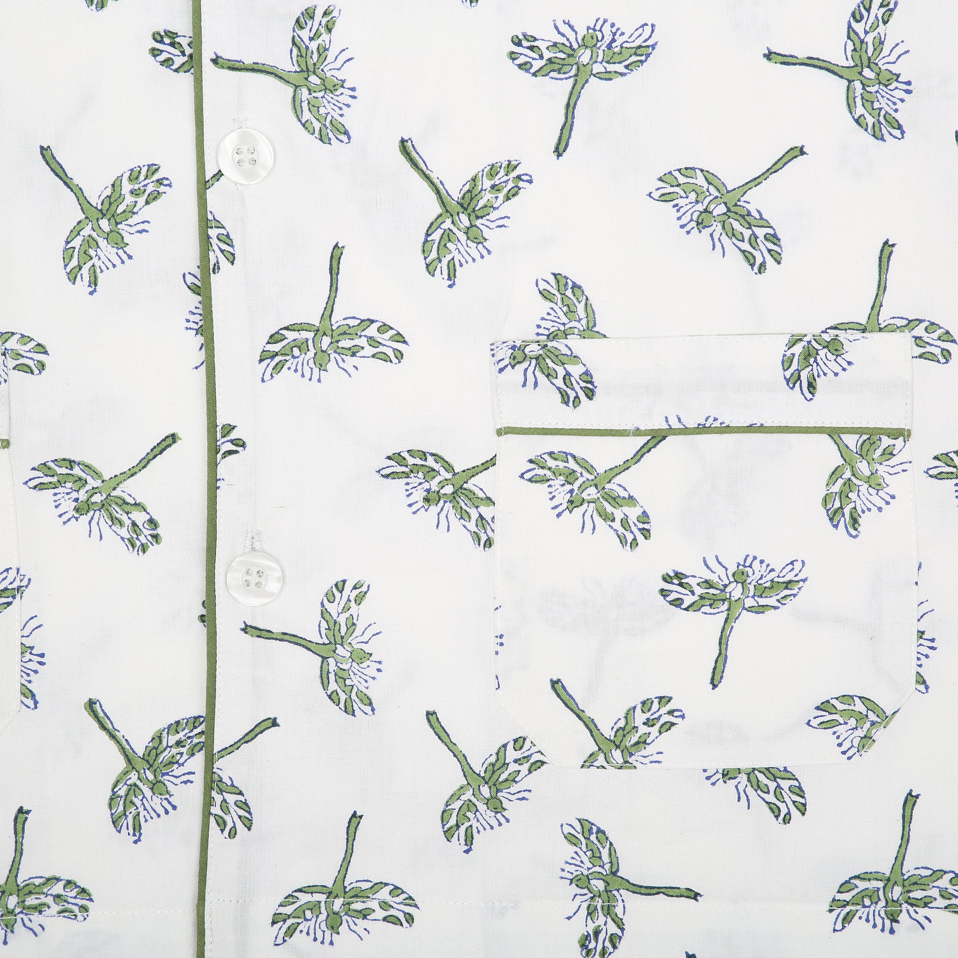 Gorgeous pyjamas hand printed with a soft green and blue dragonfly block design.