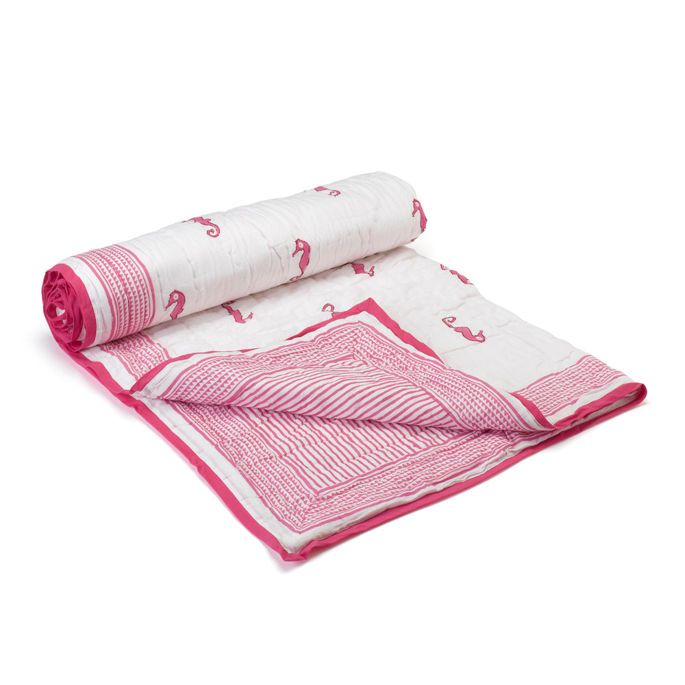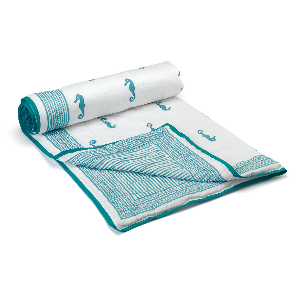 Hand block printed on 100% pure cotton and stuffed with cotton too, this quilt is breathable, soft and snuggly. Each quilt has a coordinated print on the reverse and fits a standard size UK cot bed. They make ideal bedding for up to age five but are popularly used as TV blankets for older children (and adults!) and as play mats and picnic mats for tiny tots.