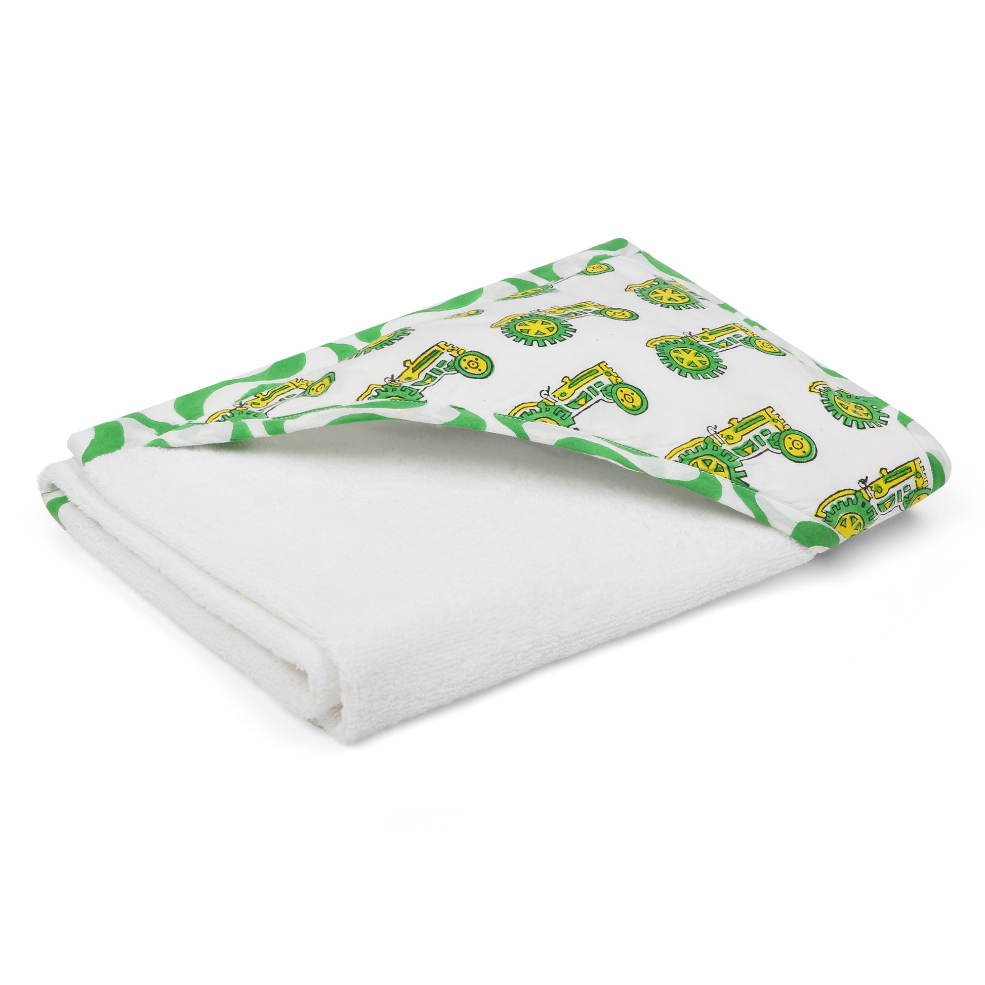 A beautiful soft hooded baby towel with a unique tractor hand block printed design on the hood.