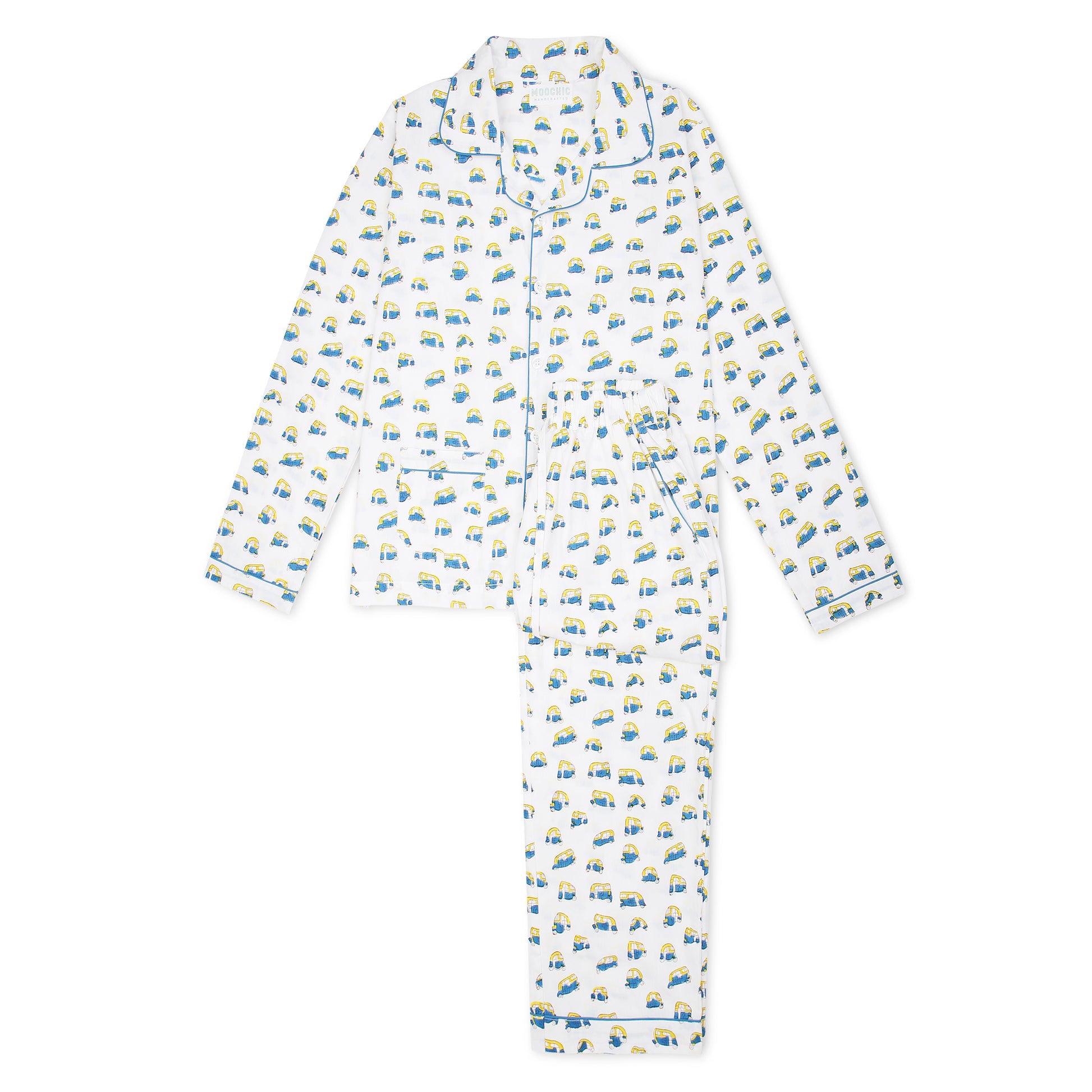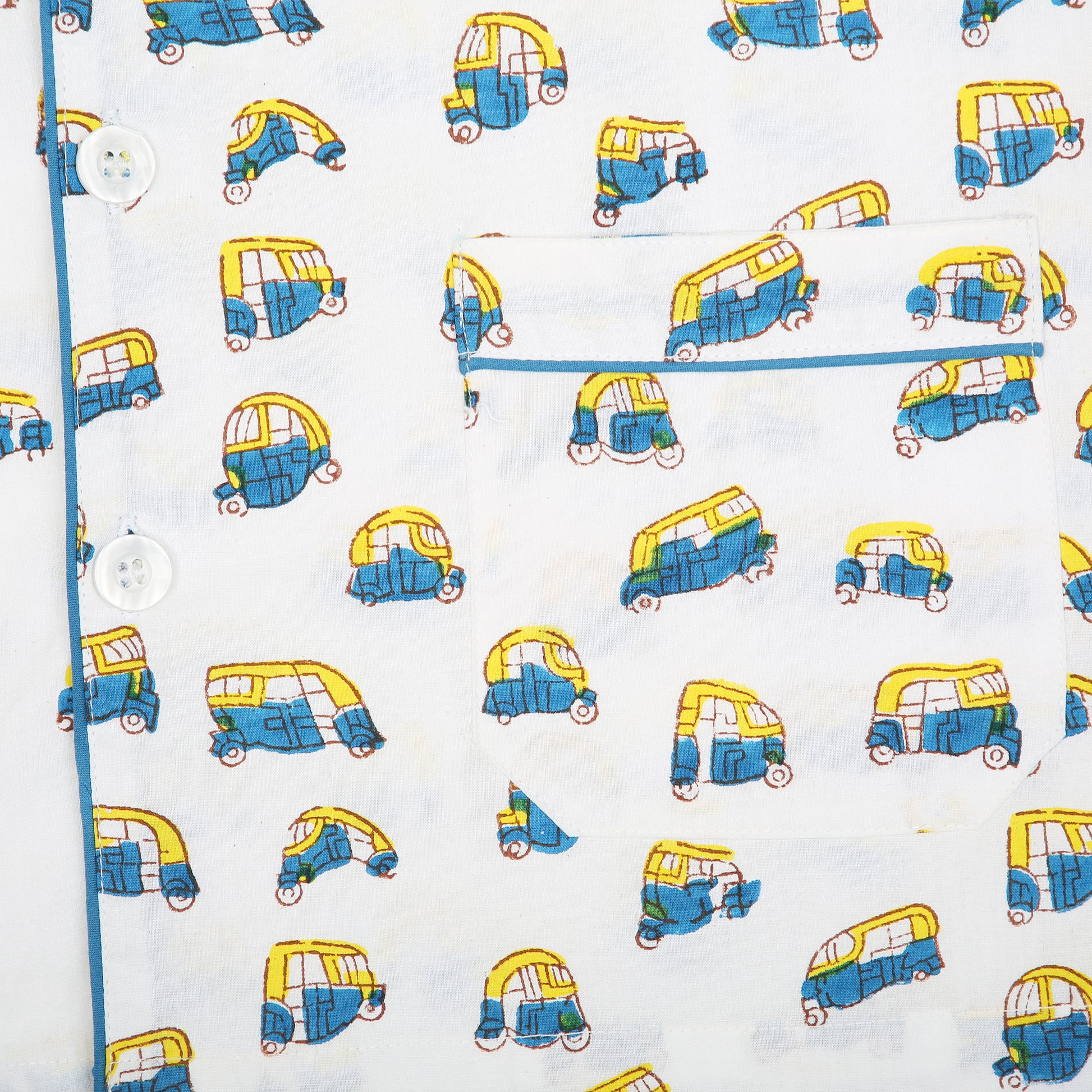 Gorgeous pyjamas hand printed with a quirky blue and yellow tuk tuk block design.